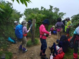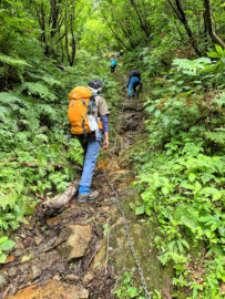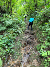 最後の難所、ザンゲ坂。疲れがたまっているので、一人ずつ慎重に降りていきます。この先、20分ほどで、大日杉に到着。山行を無事に終えることができました。