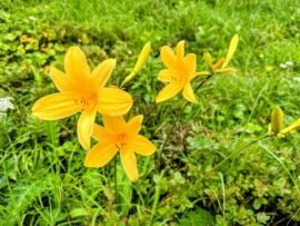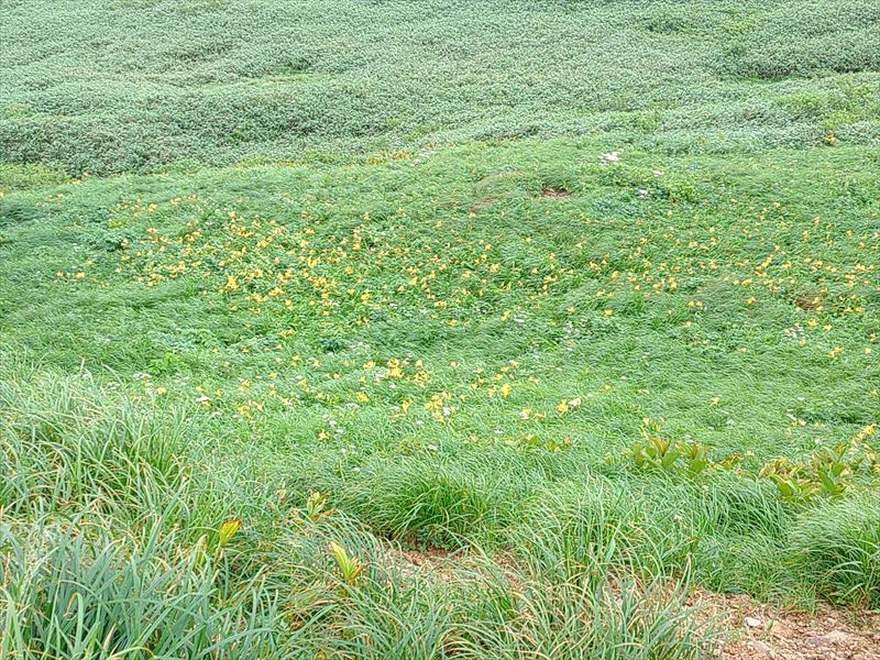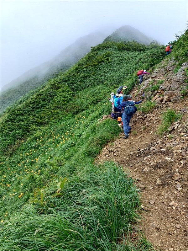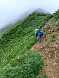 羽前小松駅では大雨の為電車が止まり、これから先の山行があやぶられましたが飯豊山、大日岳の稜線歩きは青空に恵まれ眼前の飯豊連峰の奥深い山並みと黄色のニッコウキスゲが映え、皆で楽しく歩けた事に感謝です。
