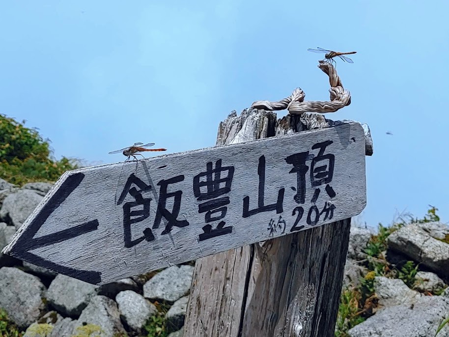 本山小屋に到着。飯豊山頂まで約20分の標識の上にトンボが止まっていました。