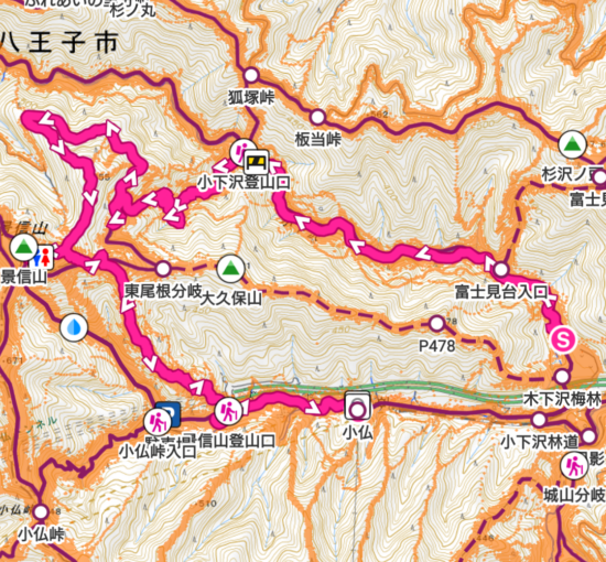 逆川ノ頭分岐11:40ー12:08逆沢ノ頭(昼食)12:47-13:12景信山13:40ー14:50
