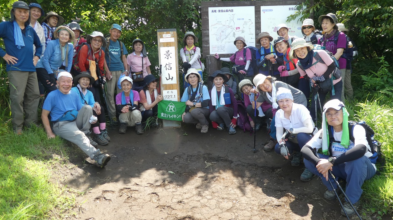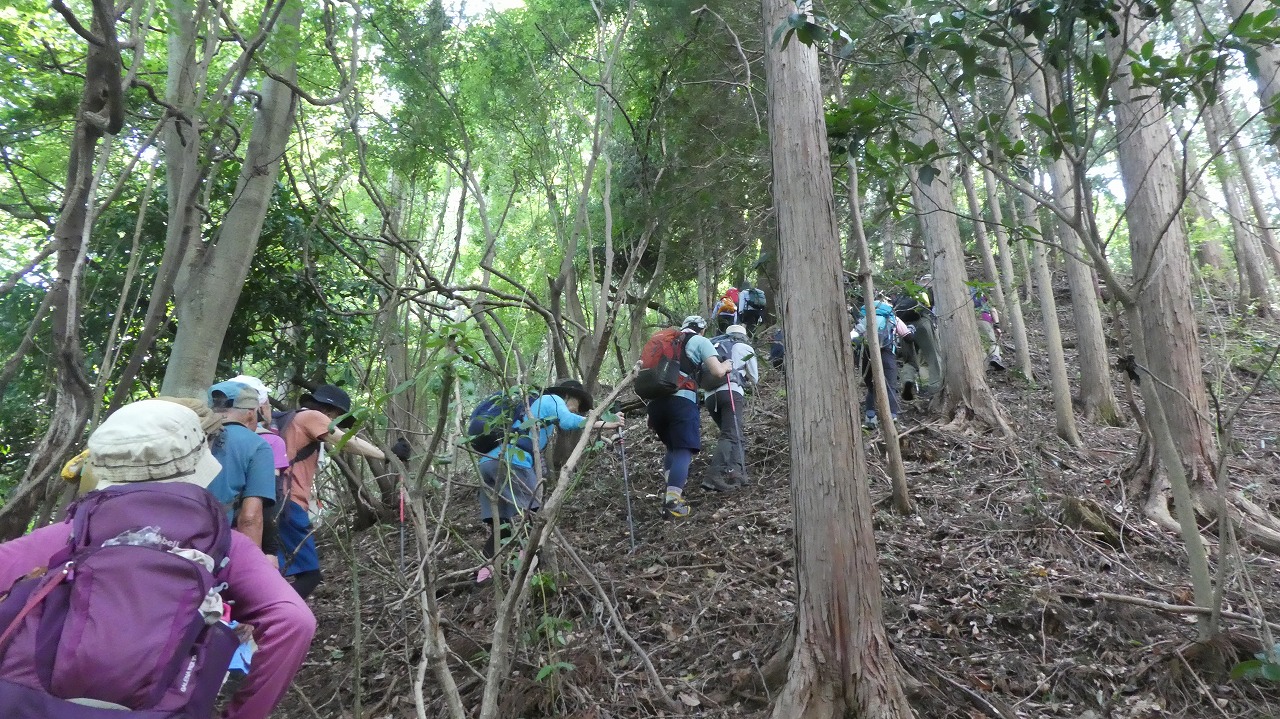 「台風で気を揉んで、その後の状態を確認する間もない山行日。コースのルートミスを台風のせいか、と単純に思い込んで参加者の方にはご迷惑をおかけしました。予定コースに戻って逆沢ノ頭でお昼。お腹いっぱいの後の急な登りを心配しましたが、ゆっくりと柔らかい地面を踏みしめてみんなで景信山まで頑張りました。