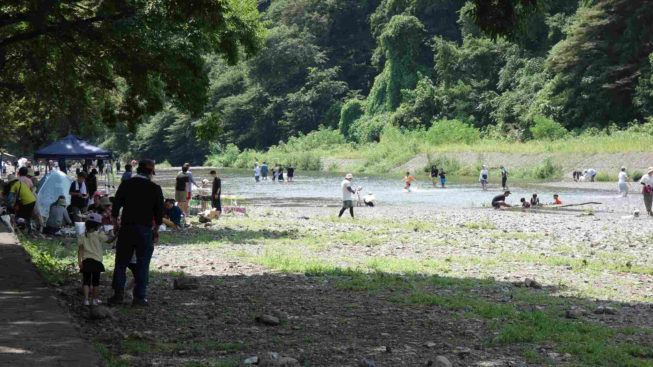 巾着田の高麗川はバーベキューと水遊するひとで賑わっつていました