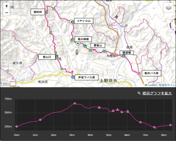 ▼コース : 芦垣下バス停 09:47 – 10:10 芦垣 – 10:17 芦垣登山口 – 11:22 御林峠 – 11:30 御林峠分岐 – 11:54 コヤシロ山(昼食) – 12:52 風の神様 – 13:14 登下分岐 – 13:22 要害山 – 13:52 山ノ神神社 – 14:08 鏡渡橋バス停 – 14:21 新井バス停 = 上野原駅
