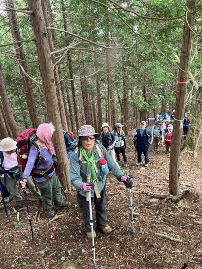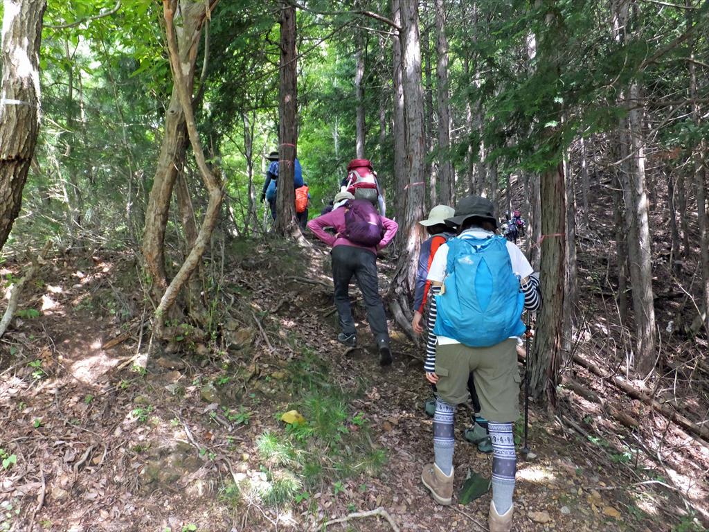 杉林の中ジクザクと高低差750m、登りの連続です。1188m地点からはきつい急登です。