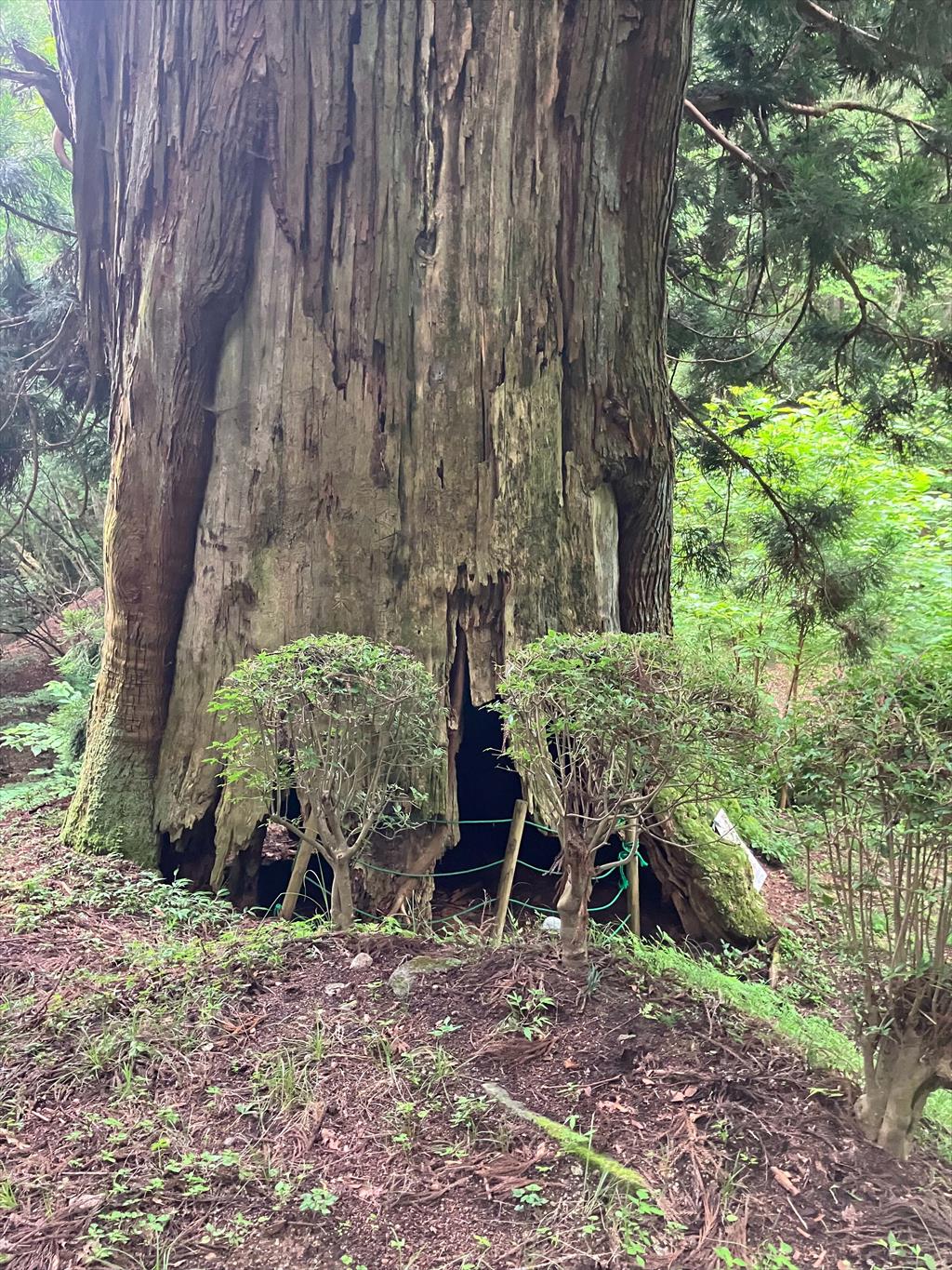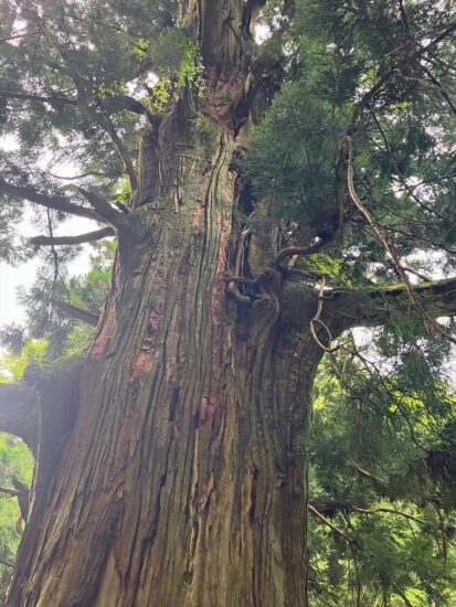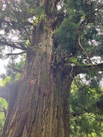 樹齢1000年を超す樹高約28m、根廻り14.8m、目通幹囲9m、幹は地上約22mで折損し、中は上まで空洞となっています。