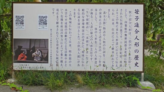 笹子追分の人形芝居は、笹子町追分新田地区に伝わる、淡路の諸座や文楽などと同じ三人遣い様式の人形芝居で義太夫節を伴奏として人形を操る郷土芸能である。これも笹子駅に建っていました。