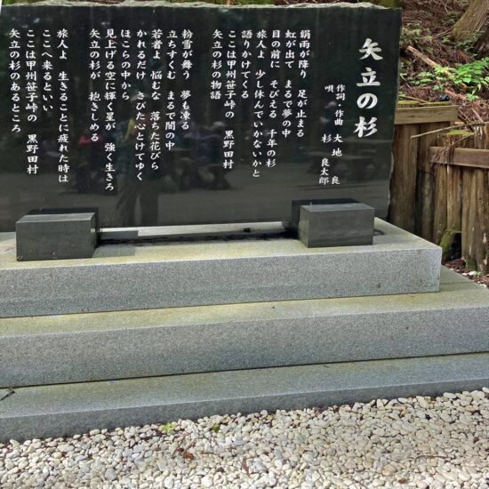 「矢立の杉」歌碑。歌手の杉良太郎さんの歌にも唄われた縁あって杉の近くには、杉良太郎氏により寄贈された身代り両面地蔵菩薩がまつられています。