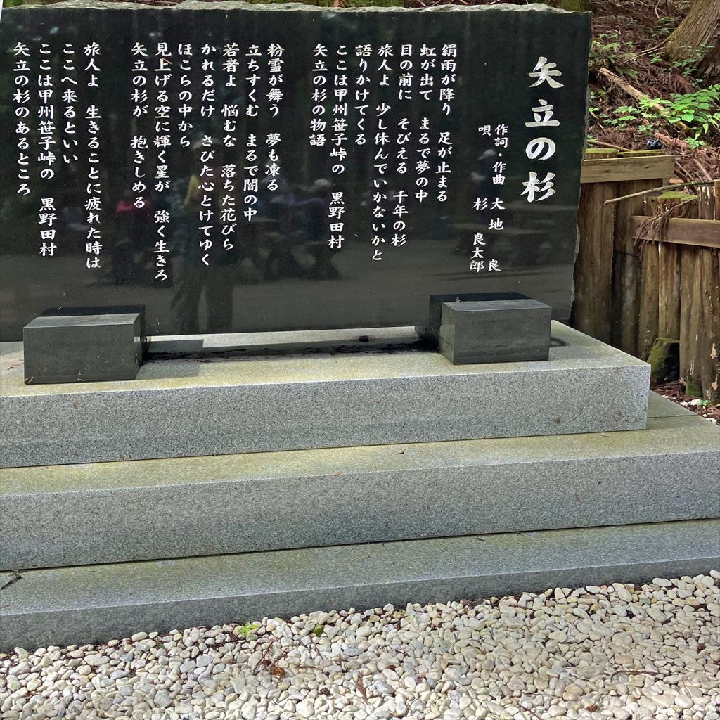 梢頭の数枝は風害によって白骨化している上に、幹の空洞内は昭和4年の火災で木炭化している。この木は甲斐国誌、甲斐叢記などの古い本に記され、江戸時代末期の浮世絵師・葛飾北斎や二代目歌川広重の名画にも残されているなど、古来有名な木であるとともに、スギの巨樹として県下有数なものである。また、樹齢1000年を超す矢立ての杉は、戦国時代合戦に赴く武士が必勝を祈願して、この木に矢を射ったことからその名前がついたと云われている。甲州街道が開通し人々の往来も盛んになり、旅人たちの憩いの場となった。