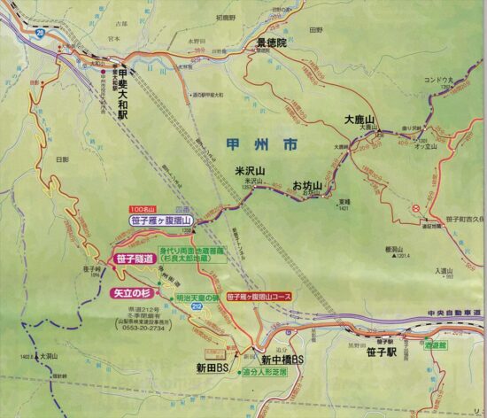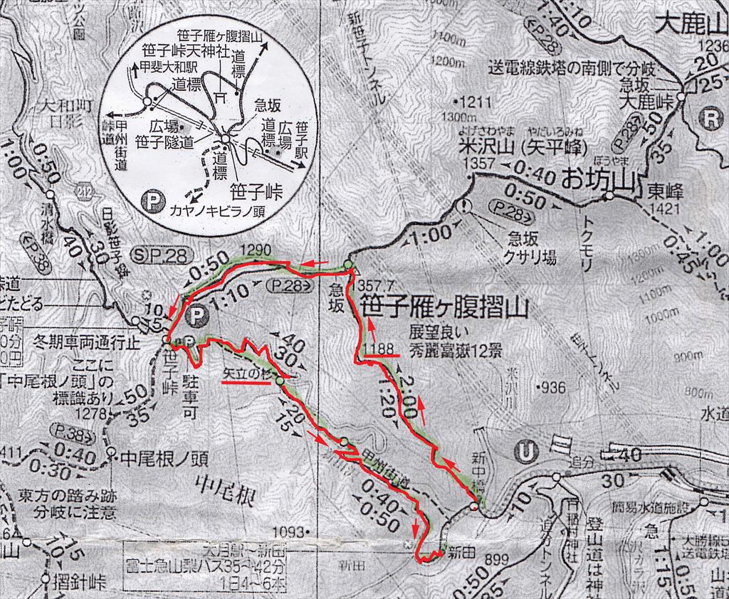 JR笹子駅=新中橋バス停→登山口9:20→1,188m地点10:50→11:45笹子雁ヶ腹摺山(昼食)12;15→尾根道分岐12:45→笹子峠13:40→矢立の杉14:15→新田バス停15;20→新中橋バス停15:49発=JR笹子駅