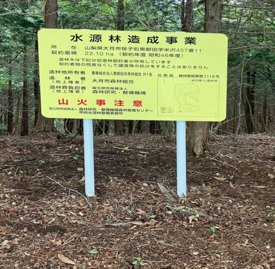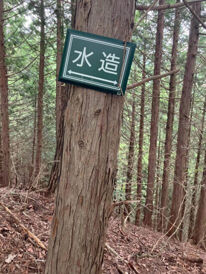 この標示板の「水造」はいったいなんだろう?。「水源林造成事業」の略であり、その事業が行われているエリアの標です。民間保有の山や林で、その場所が水源涵養上重要な場所だけど保有者が整備出来ない場合に行われるセーフティーネットの事業です。