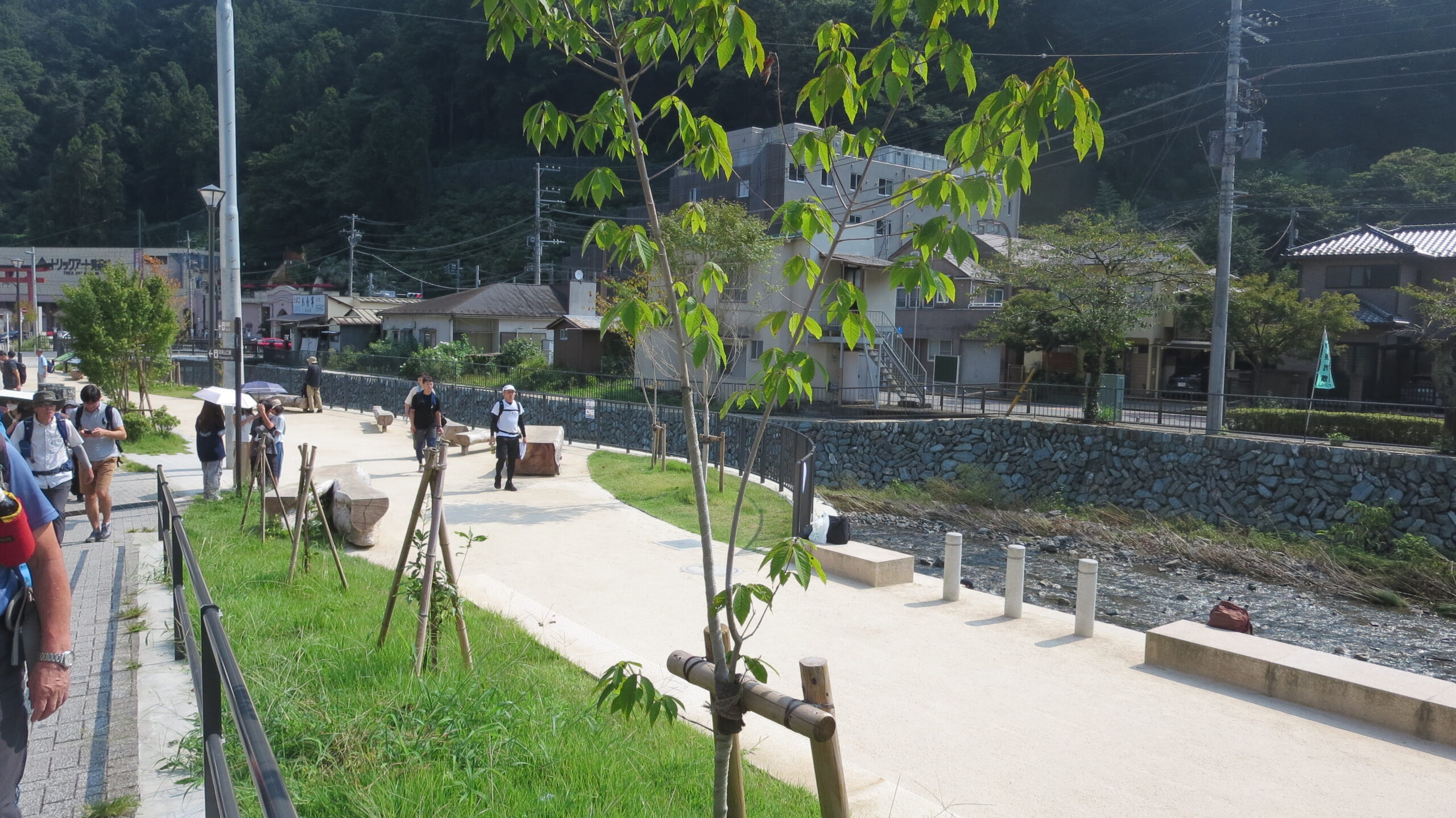 高尾山口駅の脇を流れる案内川。整備が終了して「公園」に。靴の洗い場が増えていました。