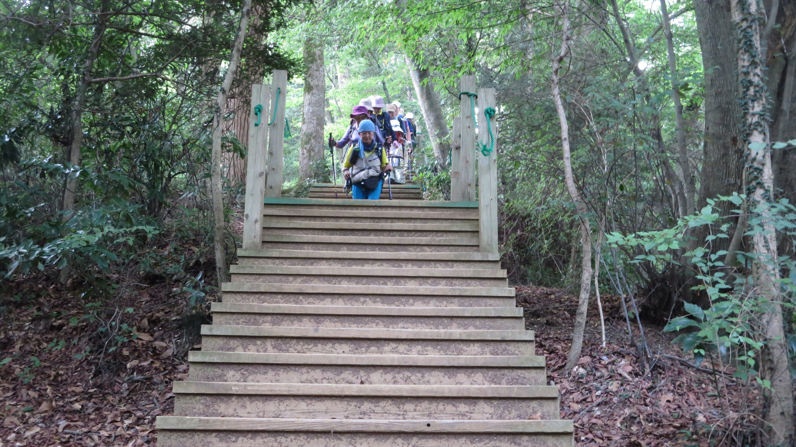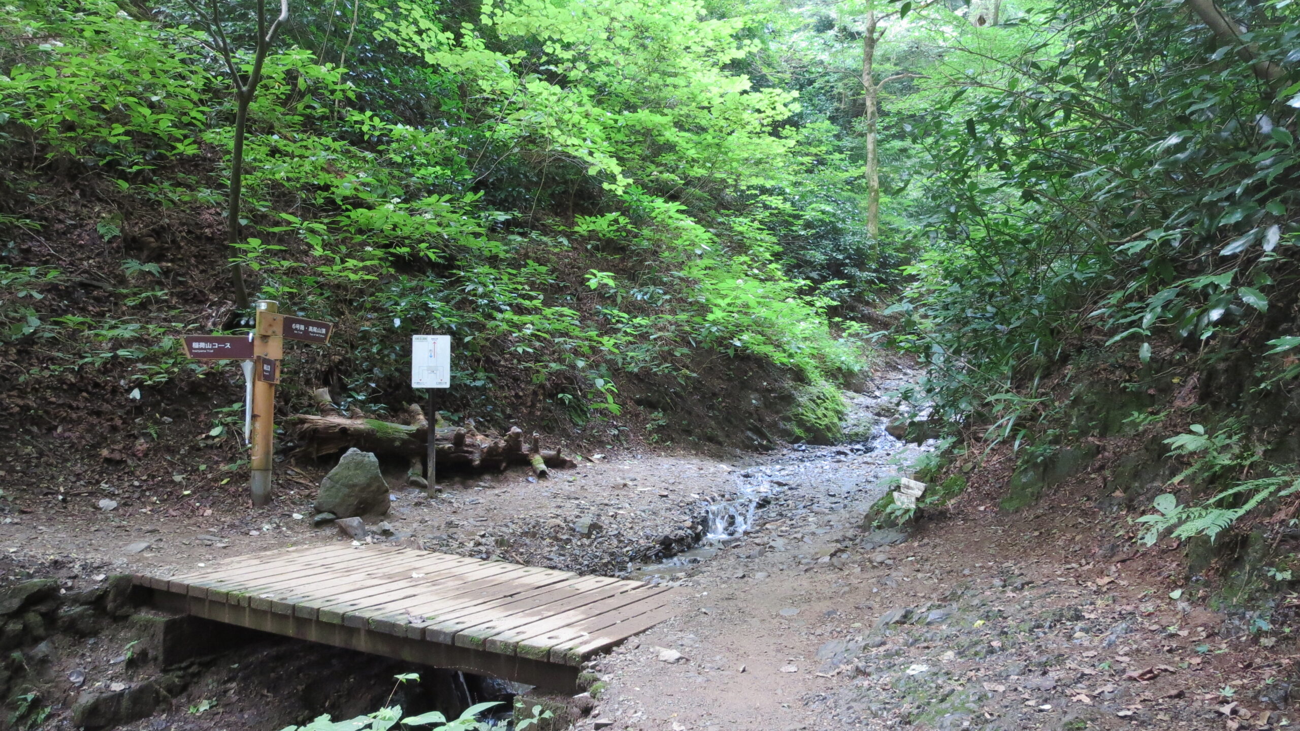 この木橋、渡らないで直進すると恐怖❔の階段が待っている。左の稲荷山コースへ向かうも階段が。