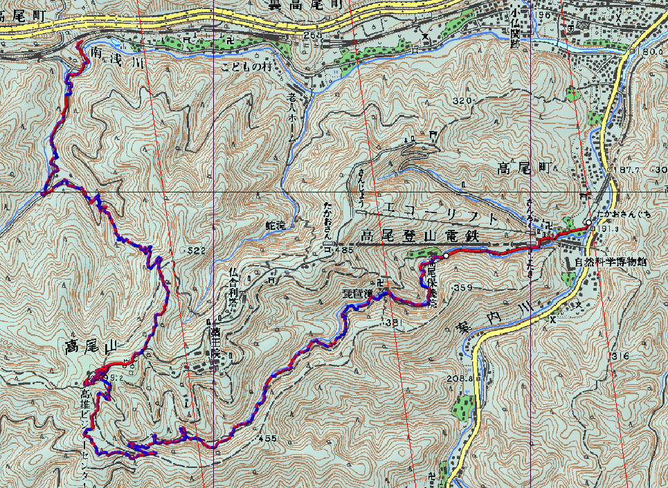 高尾山口駅前09:40→琵琶滝10:10→大山橋10:45→稲荷山コース分岐11:20→高尾山頂(昼食)11:50~12:30→いろはの森入口12:40→いろはの森分岐12:50→いろはの森13:30→林道出合(解散)13:40→日陰バス停13:50