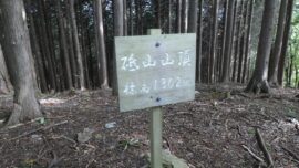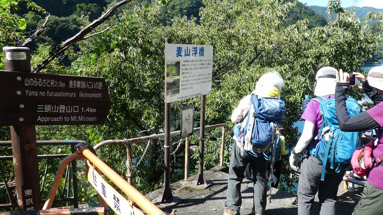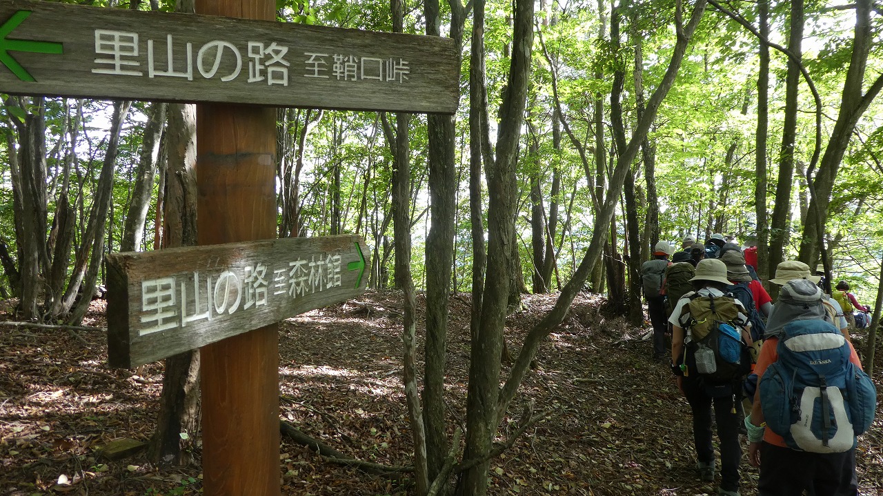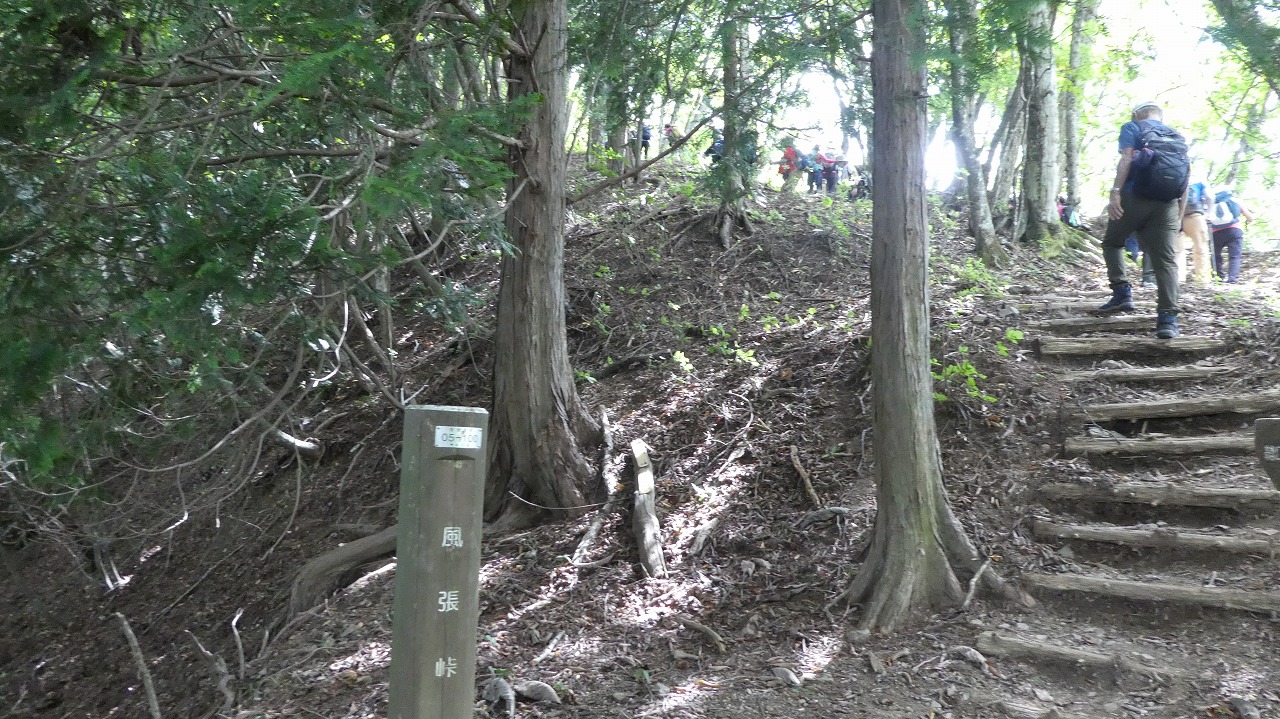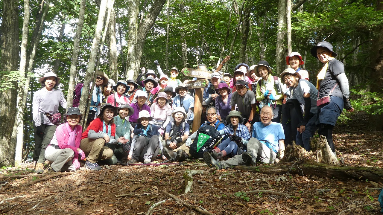 「奥多摩都民の森周辺は真夏でも涼しく歩けるところです。9月でもまだ暑かろうと計画したのがこのコース。ネックは高いバス代ですがみんな元気に集まってくれました。標高526mの麦山浮橋から東京で最も高い所を走る風張峠まで標高差620mを詰めてお昼。もう解放されたかなと歩きだせば続く道はまだ上りで、また160m程登りました。良質の砥石が採れたことで名が付いたという砥山を逃したら撮影ポイントがないからと、ここでやっと集合写真。今日唯一出会った山名標でした。