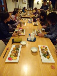 翌朝の朝食、沢山の御馳走です。 朝食後、準備体操をして出発。