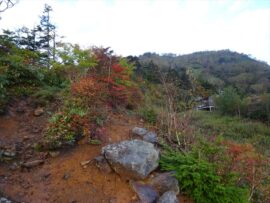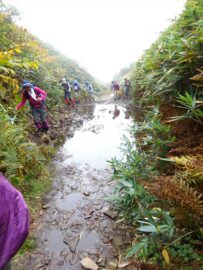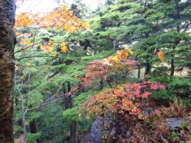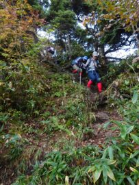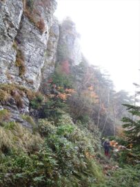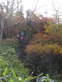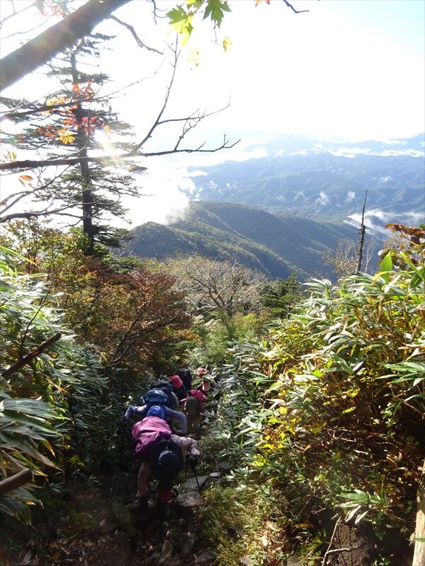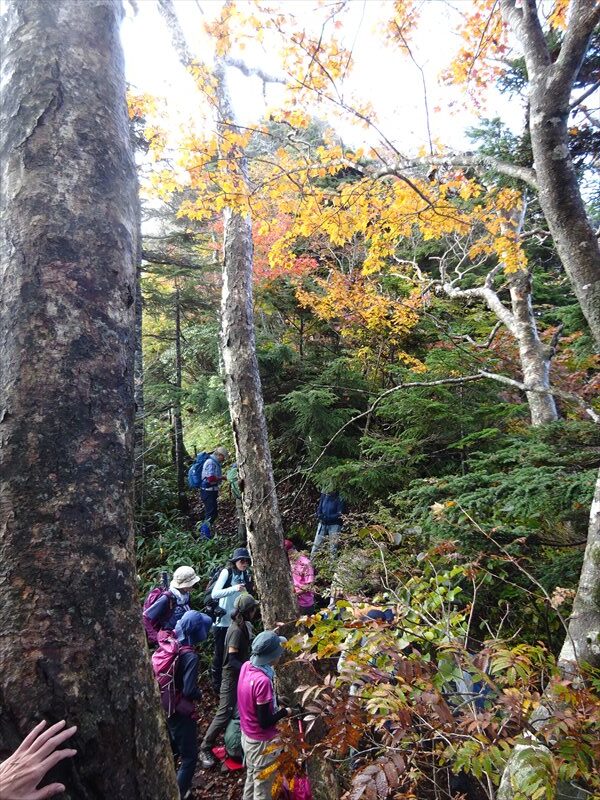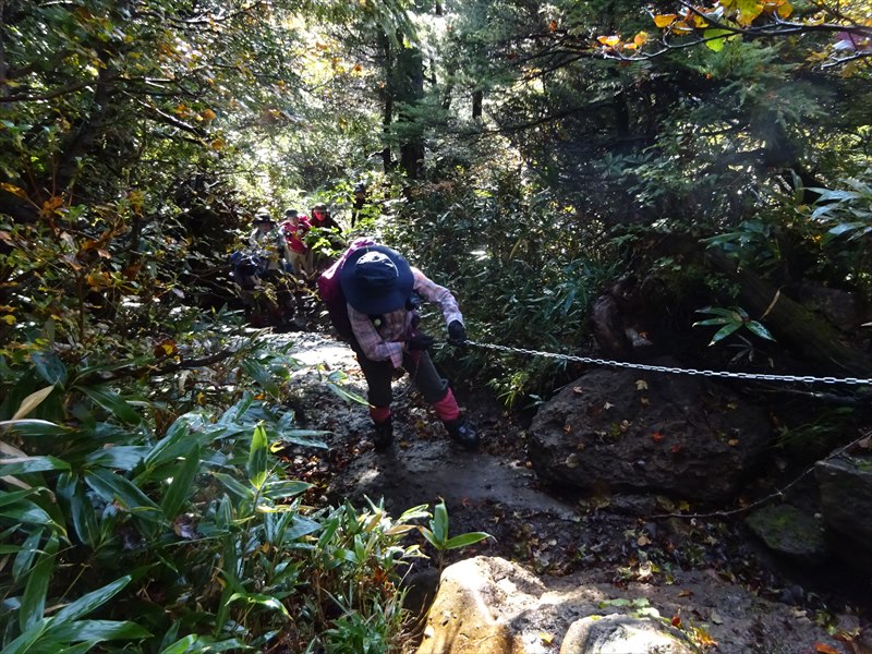 ちょうど一週間前から色付き始めたそうで、山行中は見事な紅葉を見ながら歩く事ができました。岩場あり・クサリ場も多数あり・前日の雨の影響で登山道は泥沼のような箇所も多数あり、