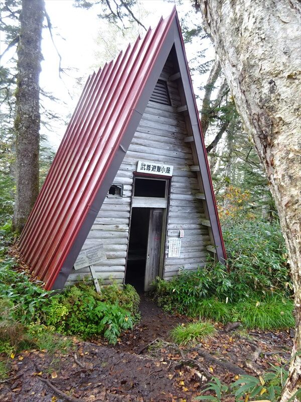 歩き辛い沼地のような下山道。 武尊避難小屋にやっと到着しました。