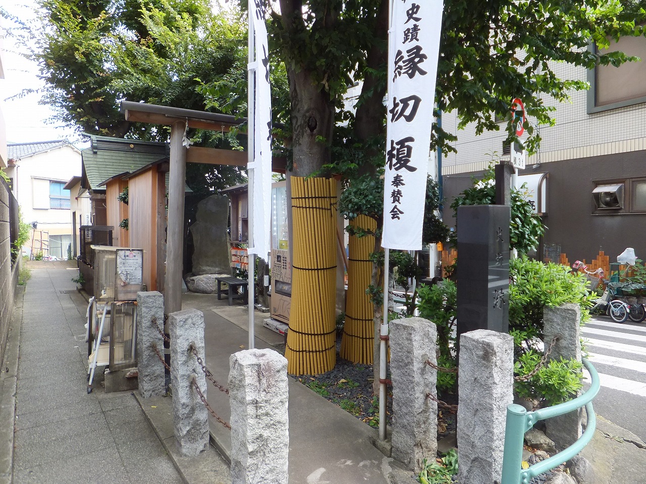 縁切榎(仲宿商店街の一角にひっそりと立つこの縁切榎は、全国から多くの参拝者が後を絶ちません。江戸時代、旗本・近藤登之助の抱屋敷にあった榎が、後に「縁切り」に結びつき、幅広い信仰を集めました。文久元年に皇女和宮が14代将軍徳川家茂に嫁ぐ際、縁起が悪いとしてこの場所を迂回したという逸話が残っているほどです。庶民の間では、男女の悪縁を切ることや、断酒などが祈願されました。近代では「悪縁は切ってくれるが、良縁は結んでくれる」ものとして礼拝の対象となっており、板橋宿有数の名所となっています。)