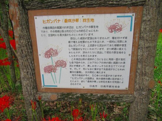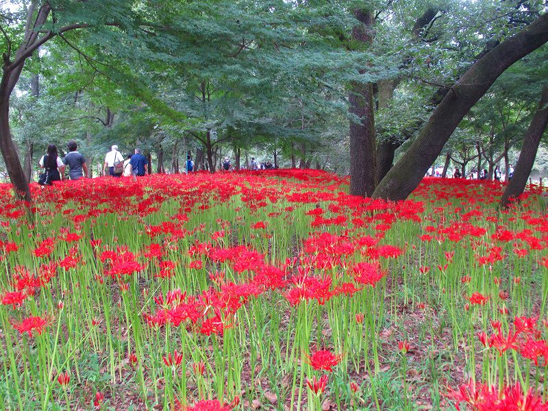 コース:JR八高線高麗川駅集合 歩行開始9:55→高麗神社10:25→聖天院10:55→厳島神社(高麗川遊歩道入口)11:20→高麗民俗資料館11:40→巾着田(曼殊沙華群生地)12:05(昼食・見学)13:30→高麗郷古民家→高麗駅