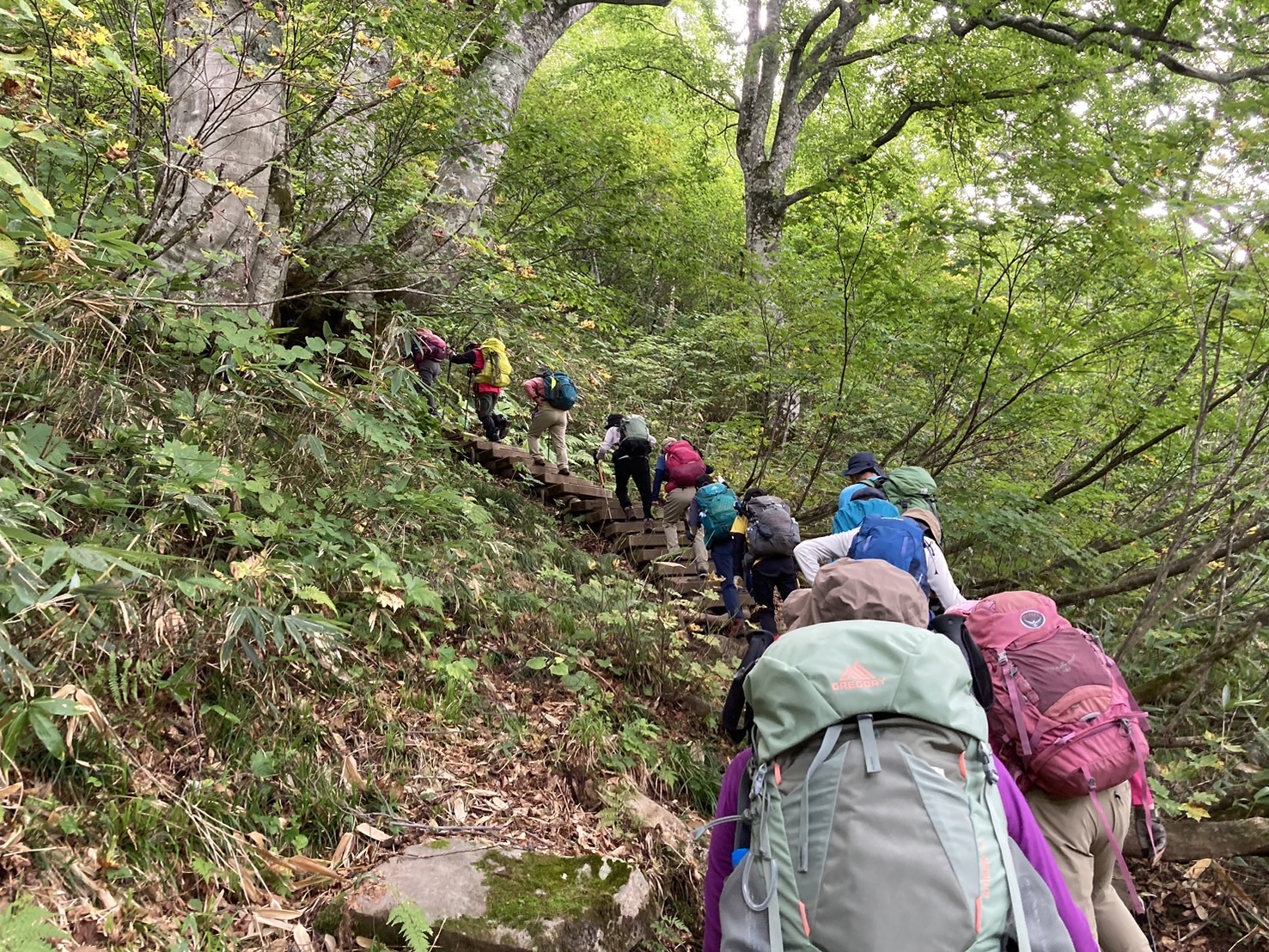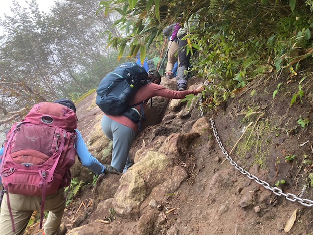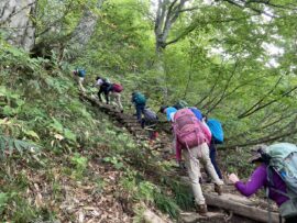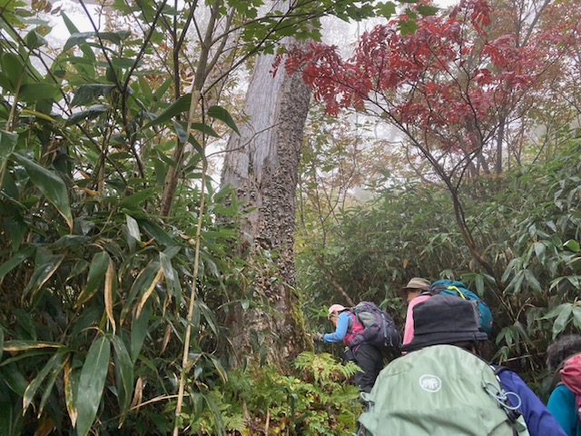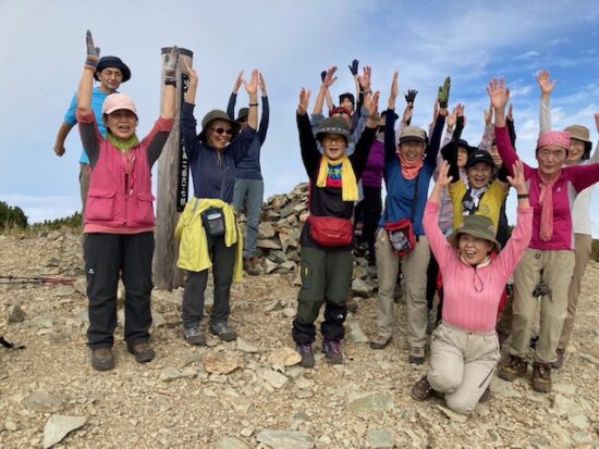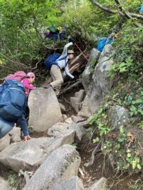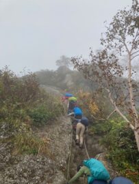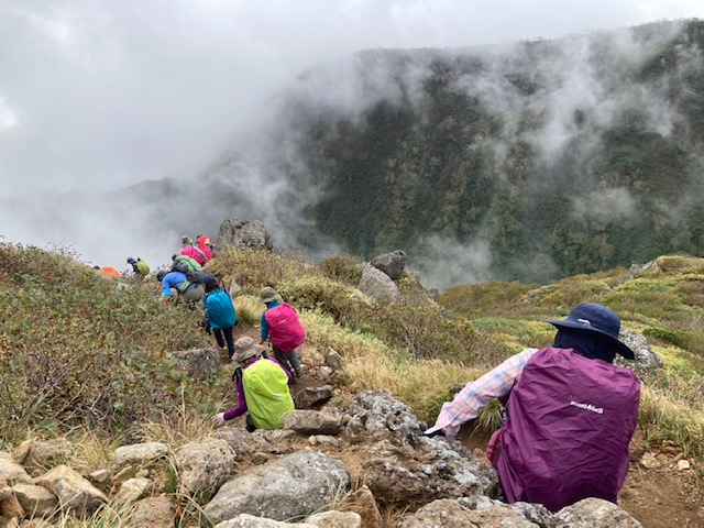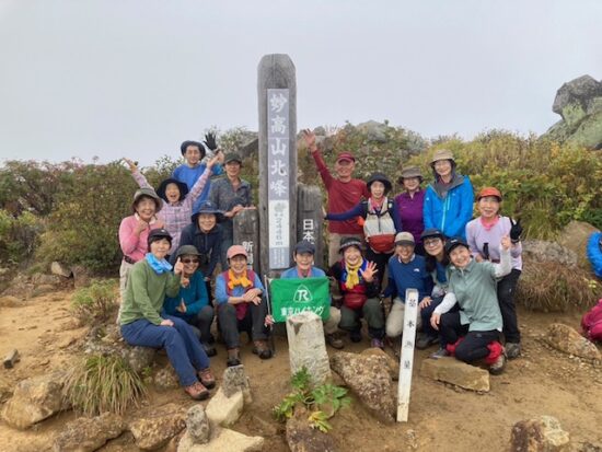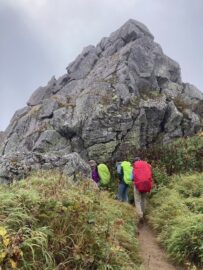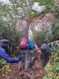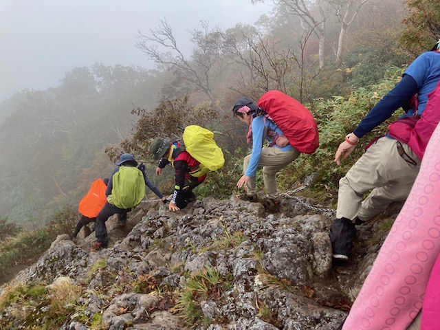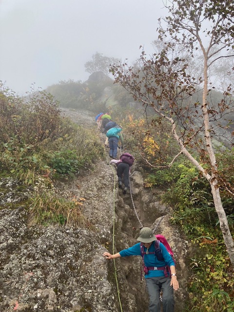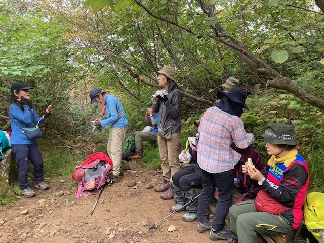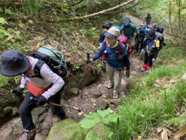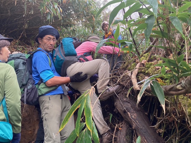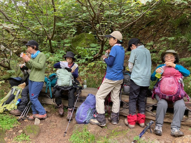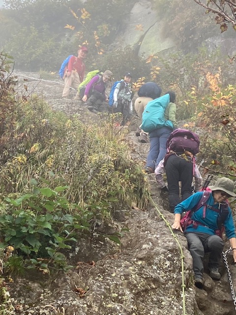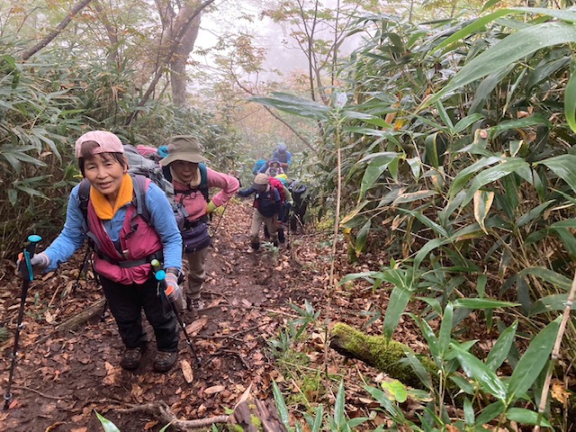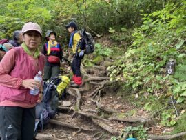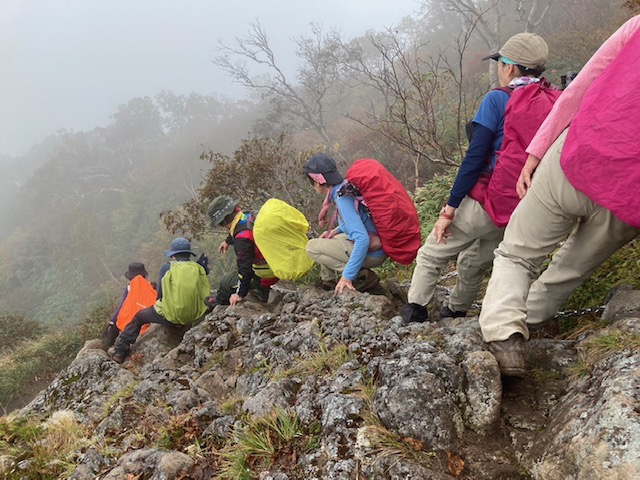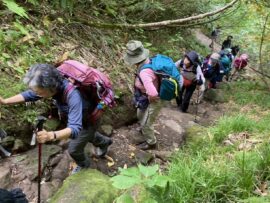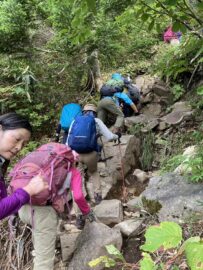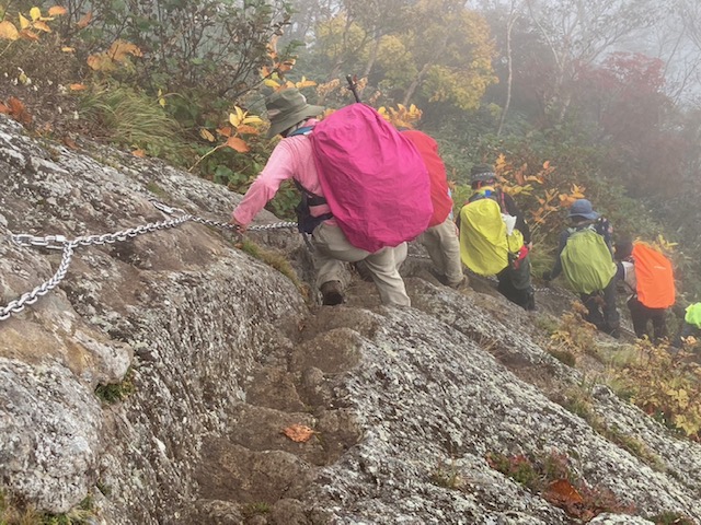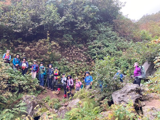 コースは雨で岩が濡れて滑りやすく岩の段差もあり大変歩きにくいコースでしたが参加リーダー・参加者の皆様の協力で全員、元気に完歩出来ました。改めて皆様の健脚に乾杯!お疲れ様でした。