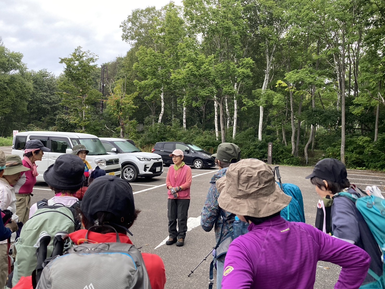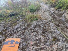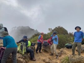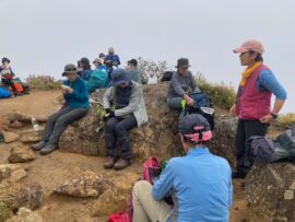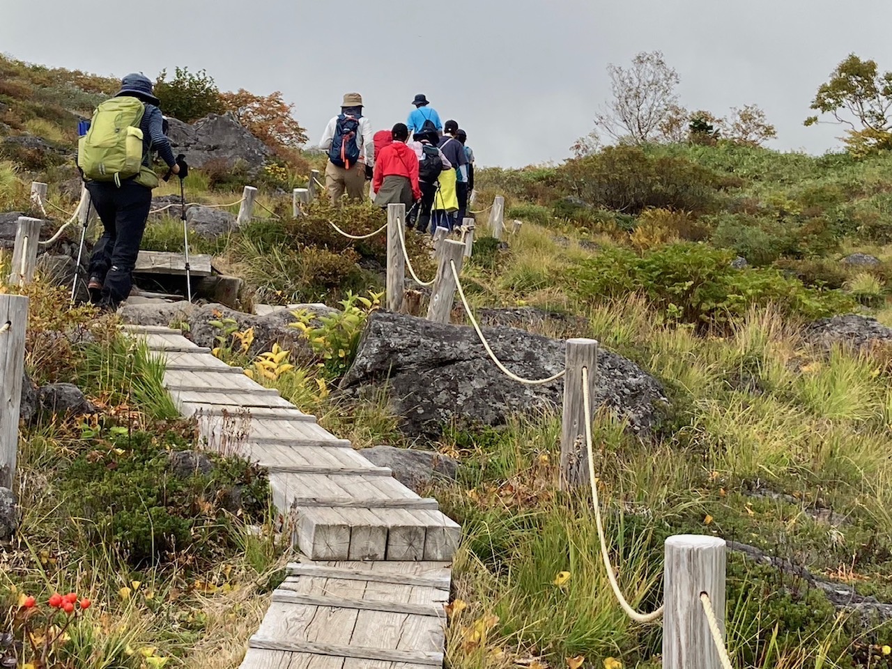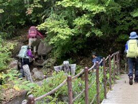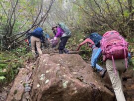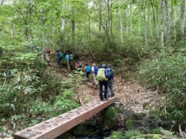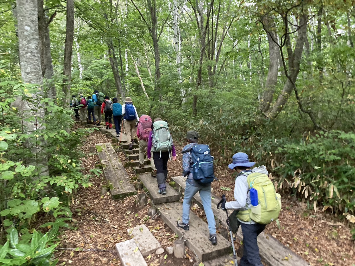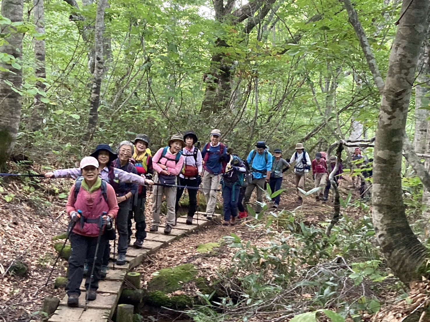 コースは雨で岩が濡れて滑りやすく岩の段差もあり大変歩きにくいコースでしたが参加リーダー・参加者の皆様の協力で全員、元気に完歩出来ました。改めて皆様の健脚に乾杯!お疲れ様でした。