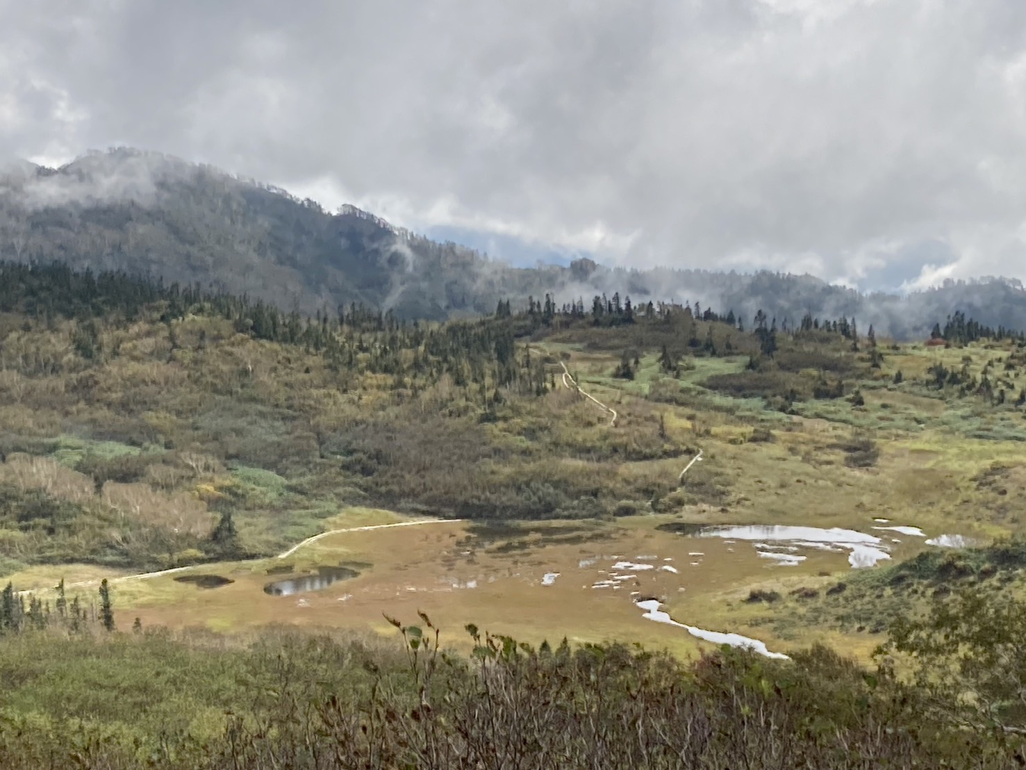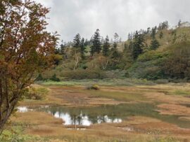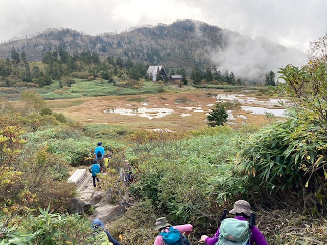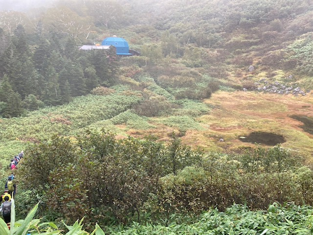 火打山から下山高谷池ヒュッテが見えます、池塘の草紅葉が色つき始まる・・・・・