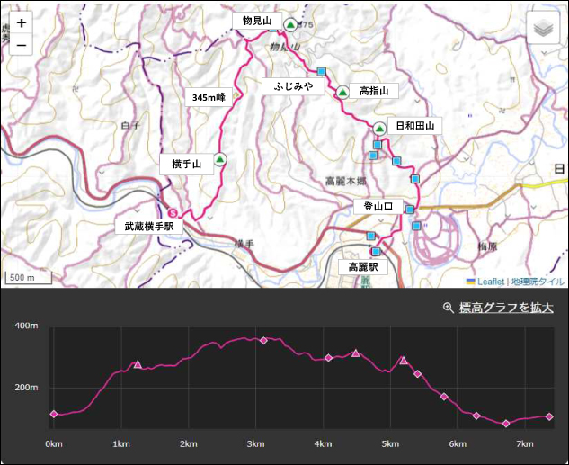 ▼コース : 武蔵横手駅09:23 – 9:56横手山 – 10:56ヤセオネ峠 – 11:02物見山 – 11:25(売店)ふじみや<昼食> – 12:06高指山 – 12:26日和田山 – 12:46金刀比羅神社 – 12:58男坂・女坂分岐 – 13:08日和田山登山口 – 13:28鹿台橋 – 13:38高麗駅