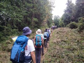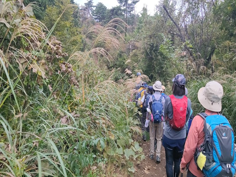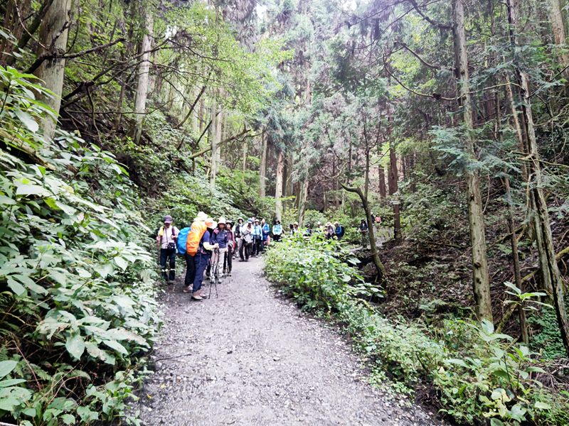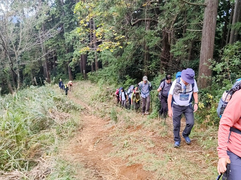 下山道は濡れてて滑りやすく慎重に歩行、和気あいあいの
