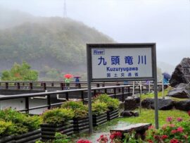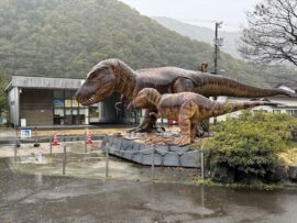 JR九頭竜線の九頭竜湖駅。名前に惹かれて、行きたかった場所です。道の駅「九頭竜」には、ティラノサウルスの親子がいました。15分間隔で動きます。