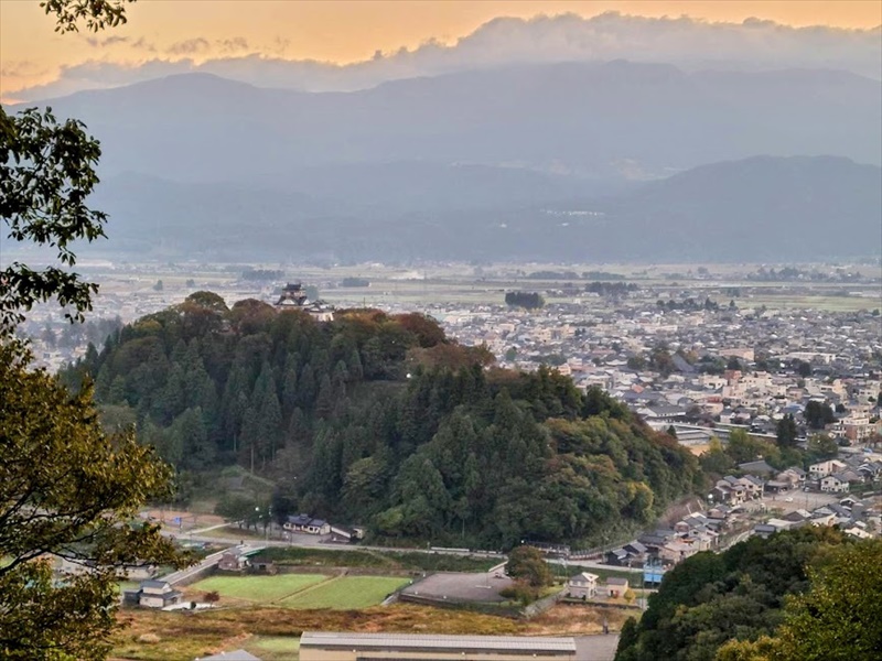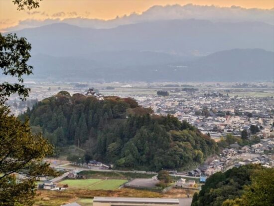 戌山城址から眺めた大野市内と越前大野城。早朝の爽やかな空気を吸って元気が出てきました。