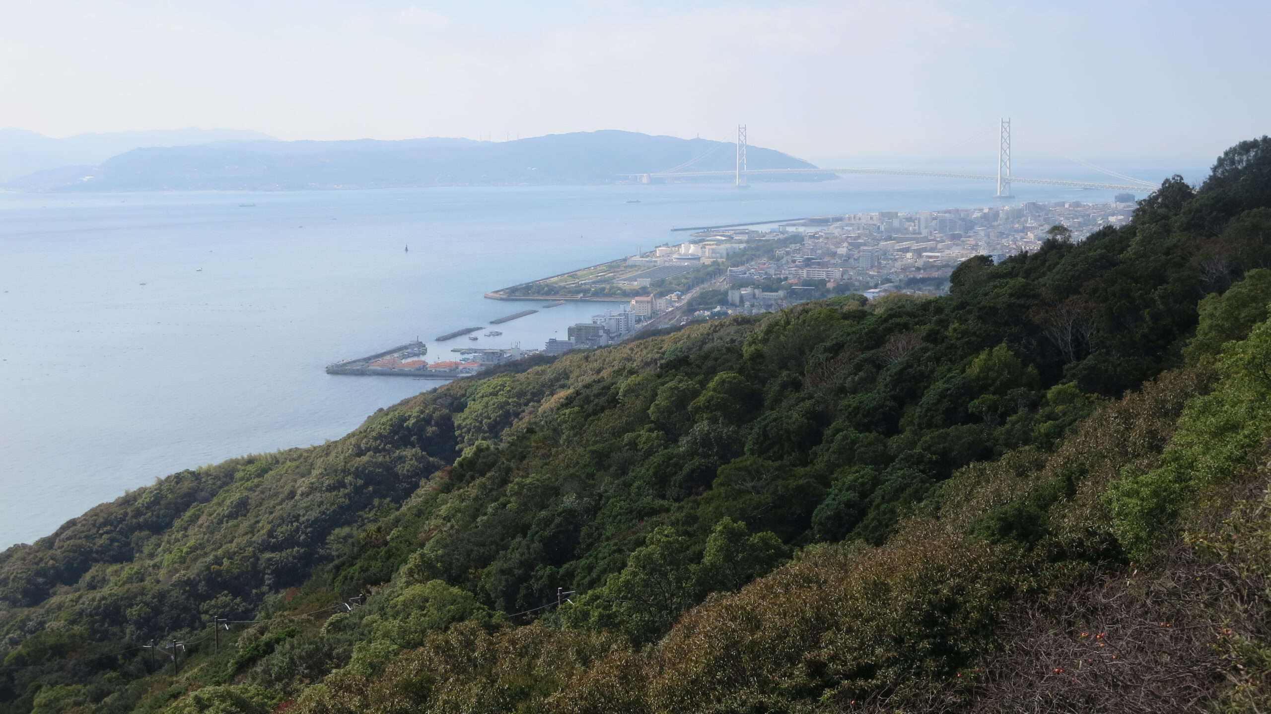 ロープウェイで鉢伏山上駅へ。「須磨海釣づり公園」の奥は淡路島。かすかに淡路海峡大橋が右に。
