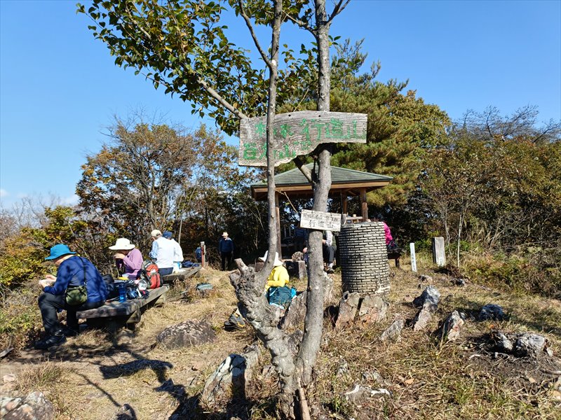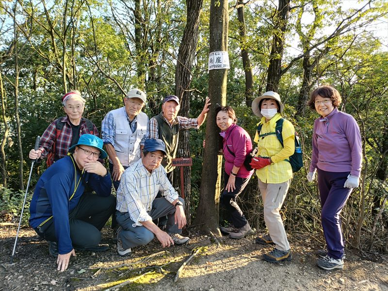 栃木百名山の両崖山で参加者両崖山(りょうがいさん)は栃木県足利市に位置する標高251mの山である。足利市は室町時代の将軍家・足利氏発祥の地であり、両崖山にはその山城・足利城本丸跡がある。南麓の足利織姫神社は縁結びにご利益があるとされる恋人の聖地とされており、秋は境内が紅葉で彩られる。この足利織姫神社から機神山(118m)・鏡山(160m)を越えると両崖山に到着し、西に進むと天狗山(258m)、北に進むと関東百名山でもある行道山(441m)へ縦走できる。2021年2月に登山者の火の不始末が原因と思われる大規模な山火事が発生し、山中の東屋などが消失した。マナーを守った登山の心がけを新たにする山でもある。