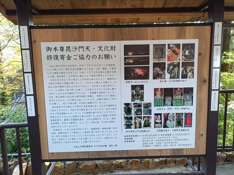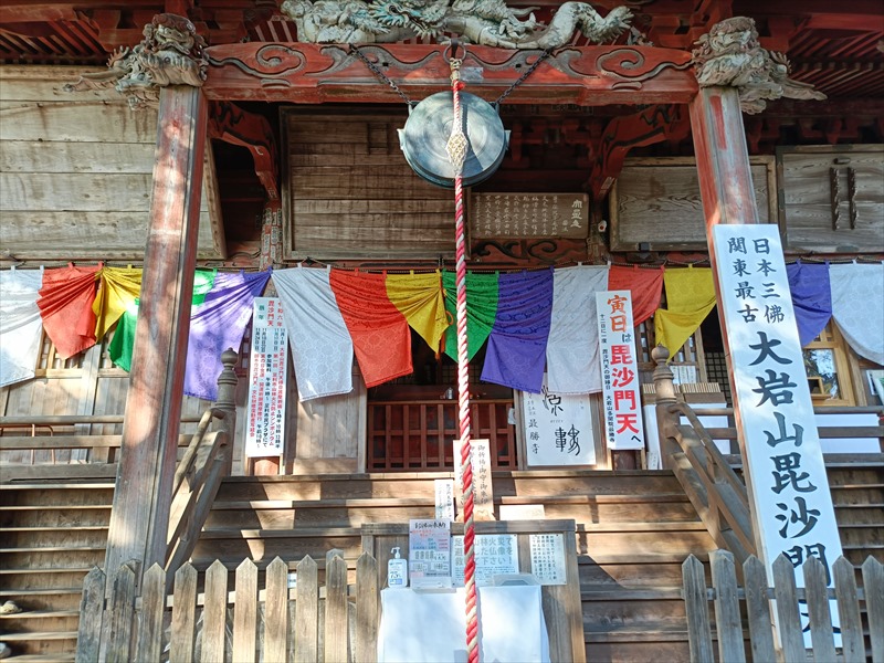 大岩山毘沙門天は、天平17年(西暦745年)に行基上人によって開かれ、聖徳太子御作の毘沙門天(多聞天)を祀ったのが始まりと言われています。その後、聖武天皇より、本堂、経堂、山門、鐘楼、三重塔、十二坊の諸堂を賜るとともに、「大岩山多聞院最勝寺」という山号を賜りました。その後は鎮護国家御祈祷の一大霊場となるとともに、修験道の修行場として一大霊山となり、以来足利氏などの名だたる武将から信仰を集めてきました。 以降、人々の厚い信仰によって法灯は受け継がれてきましたが、文安4年(1447年)に雷火のため諸堂は焼失してしまいます。現在の毘沙門天本堂は、江戸時代の宝暦12年(1762年)に再建されたものです。
