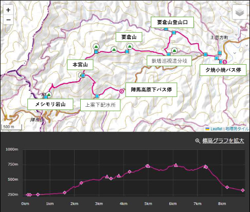 ▼コース : 夕焼小焼バス停 08:50 – 09:50 要倉山登山口 – 10:18 鉄塔巡視道分岐 – 11:00 要倉山 – 11:36 御堂窪山分岐 – 11:50 本宮山(昼食) 12:23 – 12:50 メシモリ岩山 – 13:40 本宮山- 13:40 熊野神社本宮跡の碑 – 14:14 上案下配水所 – 14:40 陣馬高原下