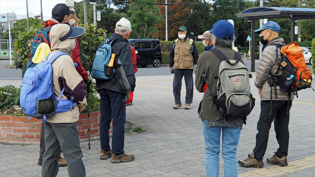 つきみ野駅前(大和市)で、参加リーダー等紹介及び今日のコースと「横浜水道みち」の歴史的を説明