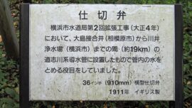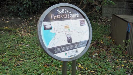 この水道みちは、津久井郡三井村(現相模原市緑区三井)から横浜村の野毛山浄水場(現横浜市西区)まで約44kmを、1887年(明治20年)わが国最初の近代の水道として創設されました。運搬手段のなかっか当時、鉄管や資材の運搬用としてレールを敷きトロッコを使用し水道管を敷設しました。横浜市民の給水の一歩と近代消防の一歩を歩んだ道です。横浜水道局