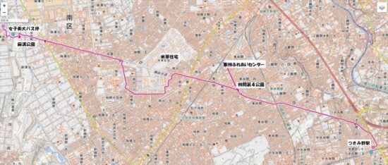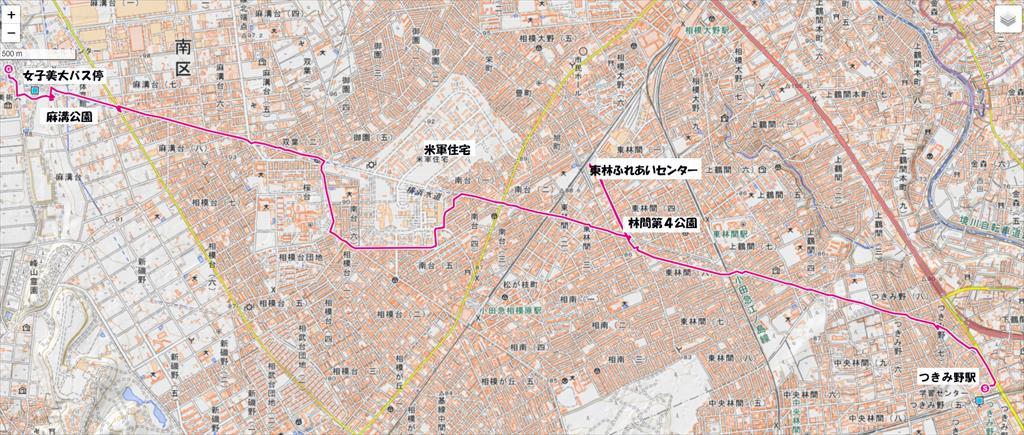 東急線田園都市線つきみ野駅10:08→東林ふれあいセンター(トイレ休憩)→林間第4公園(昼食)11:42→12:42米軍住宅正門→13:55麻溝公園14:15→14:23女子美大バス停=小田急線相模大野駅