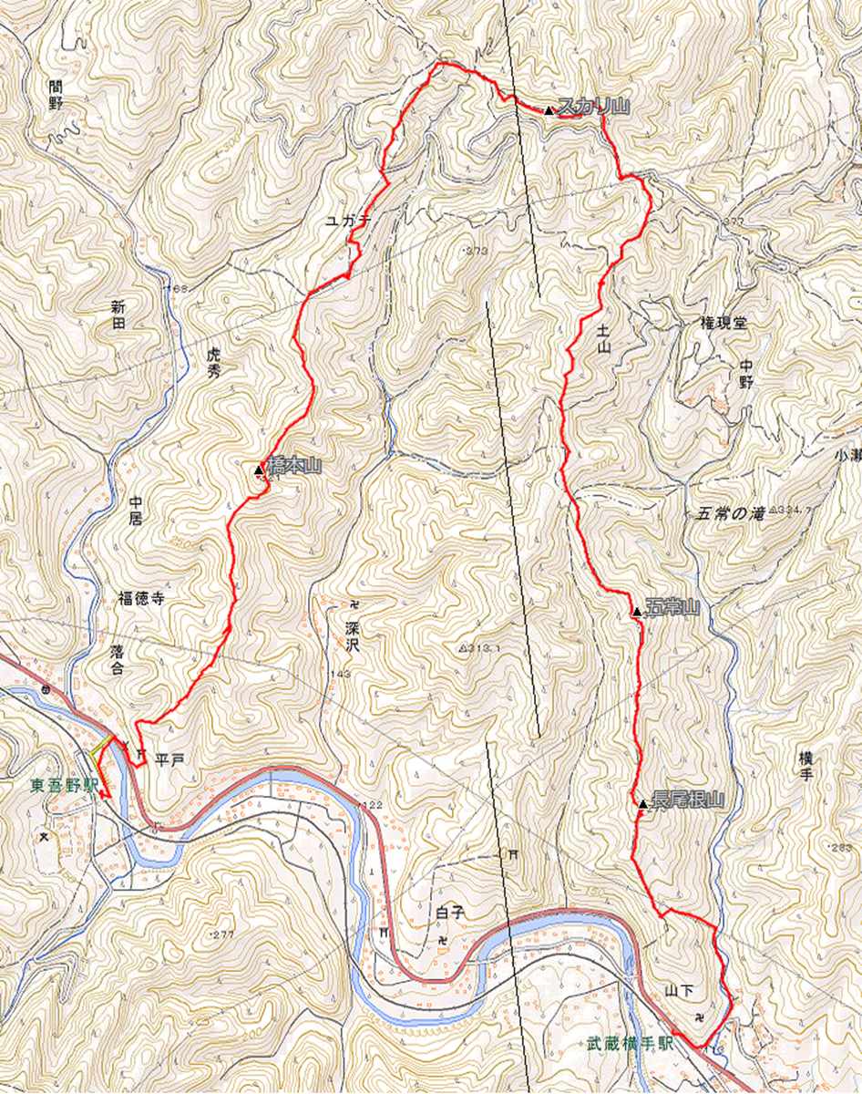 ▼コース:駅9:30→長尾根山10:05→五常山10:30→沢山峠11:05→西大峰11:25→12:00スカリ山登山口手前(昼食)12:30→スカリ山13:00→ユガテ13:50→橋本山14:30→武蔵横手駅解散15:10