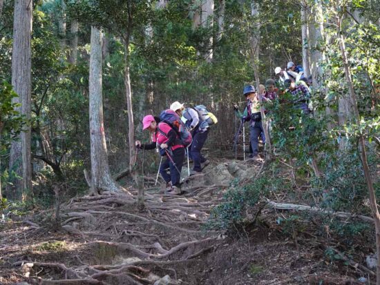 長尾根山は273mと低山ながらもバリコースです。急坂を一気に登る、立ち止まるとズルズル滑る、巻道もあったがやめることにした。又、スカリ山は展望が良く遠くまで見えたが、風が冷たくすぐに下りユガテに向かう。アップダウンの連続で疲れは見えたがベテランの会員さんに気を遣って頂き無事下山出来ました。皆さんお疲れ様でした。 小泉純子