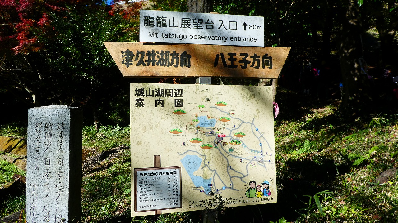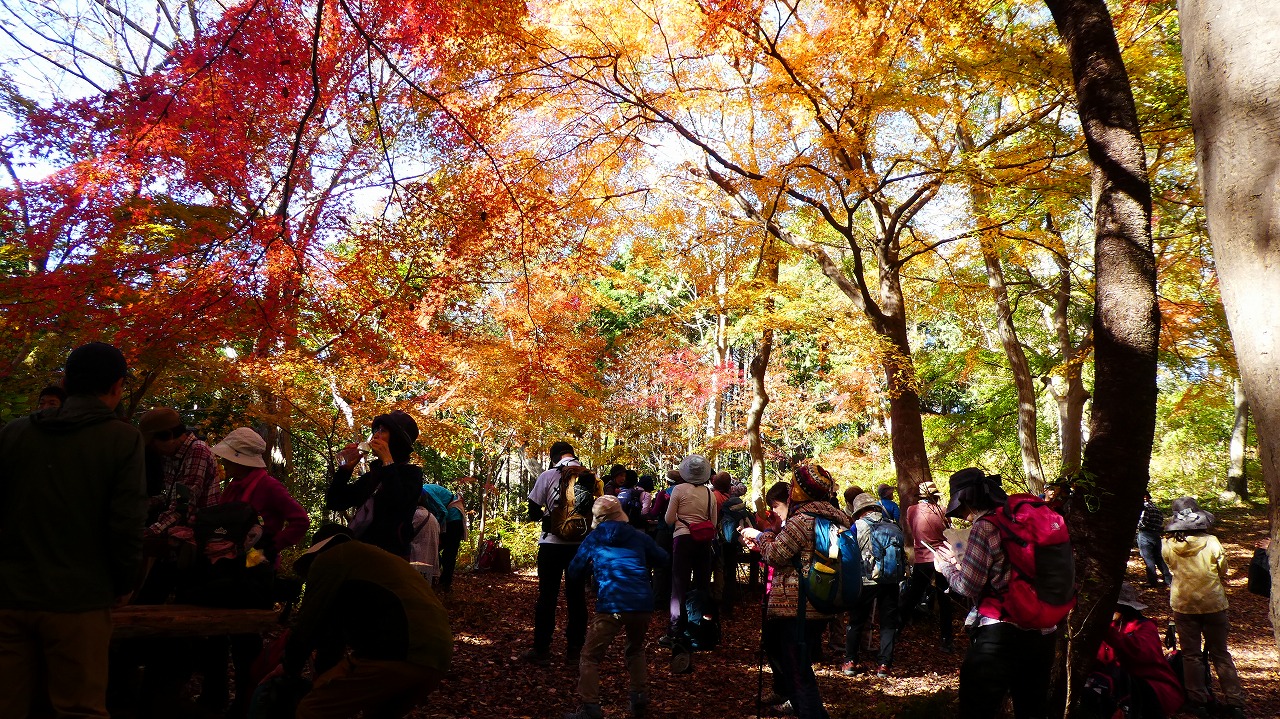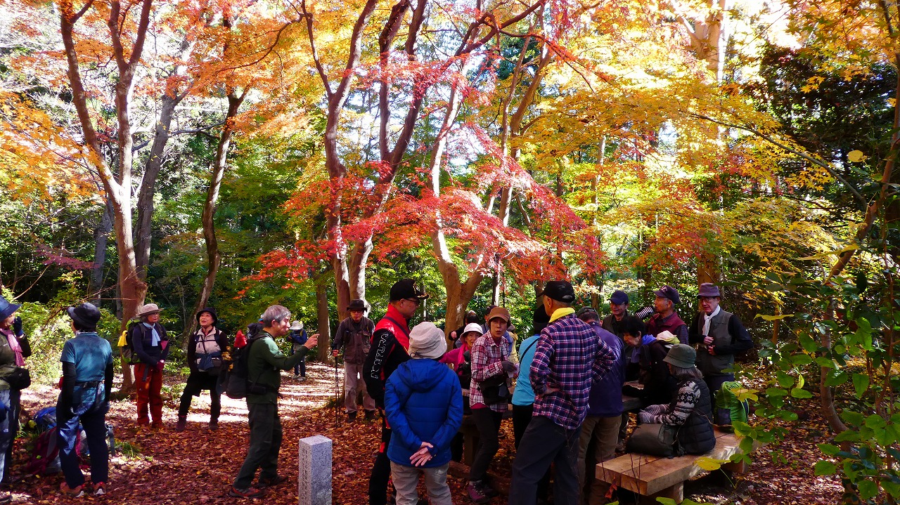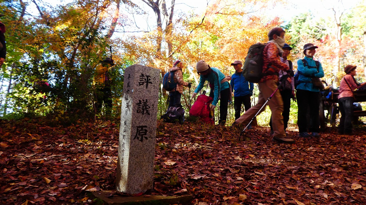 「評議原は小田原攻めの際に片倉、津久井、小松城の武将たちが秀吉にどう降伏するかを相談した場所とされています。この辺りを毎日歩かれているという男性によると今の色付き度は5、上から陽の差す昼が見頃なんだとか。上の雨降龍籠山の展望台からは都内や神奈川のビル群、遠くは赤城山、男体山、房総半島の説明も受けました。おまけは房総半島上にチョコッと頭を出している冨山。来週に登る予定なので少~し嬉しい!