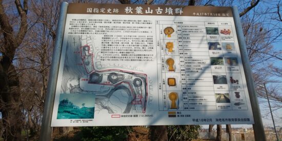右側のこんもりした丘が秋葉山古墳群です。(秋葉山古墳群は今から約1700年前、弥生時代から古墳時代の過渡期に造られた古墳群です。)