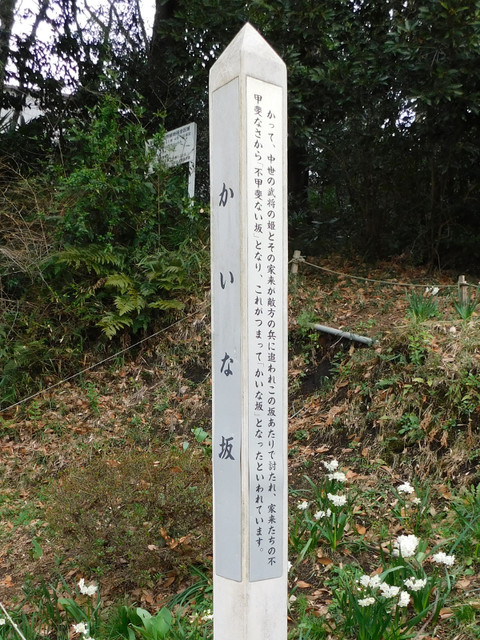 かいな坂(護王姫の伝説の中で、この坂辺りで追討軍に追いつかれ、護王姫の護衛兵は全員討ち死、護王姫の生んだ子供も追討兵に殺されてしまったといわれています。護王姫も子供も守れなかった「不甲斐ない」家臣達がこの坂で討ち死にしたことから「不甲斐ない坂」となり、「かいな坂」と転訛したといわれています。)