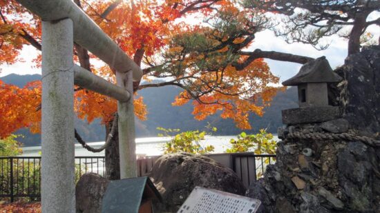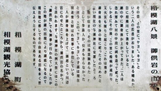 この地区では与瀬神社を祀っていますが、ご神体は相模川での漁の網に掛かったとされ、その場所にあったのがこの岩です。しかし、相模湖建設のために元々の岩は湖底に沈み、現在はその一部の岩が湖畔に移されています。4月の祭りには、御供岩にも新しいしめ縄が巻かれ、また、神社の神輿(みこし)はここまで担がれてから、神社に戻ります