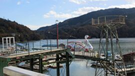 上部の白い構造物は、さがみ湖MORIMORI(旧プレジャーフォレスト)のマッスルモンスター、絶叫吊り橋等のアトラクションです。