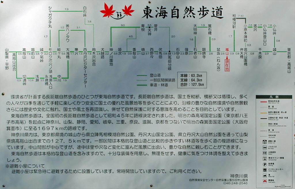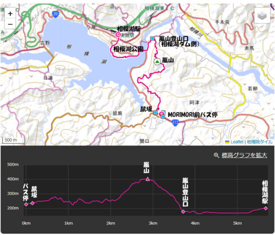 JR相模湖駅=相模湖MORIMORI前バス停9:31→鼠坂→11:32嵐山12:14→嵐山登山口(相模湖ダム側)12:47→13:02相模湖公園13:30→13:41相模湖駅