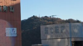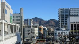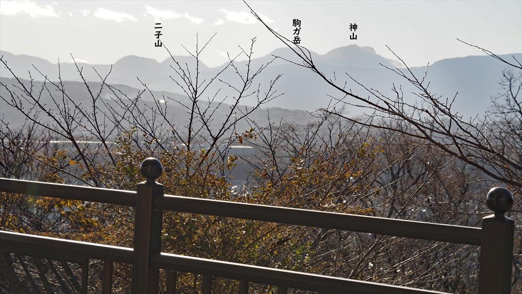 秦野駅のデッキから高取山と権現山が正面に見えた