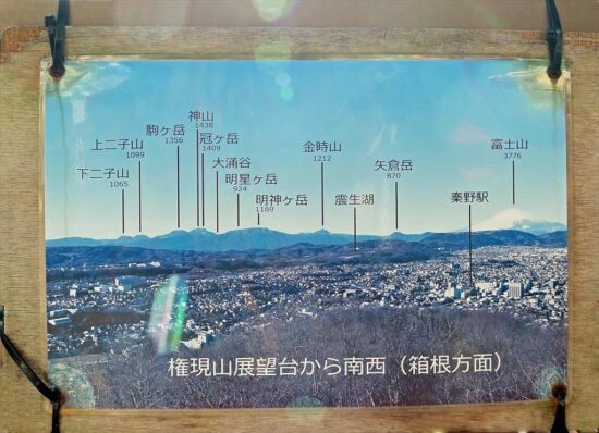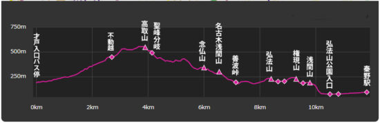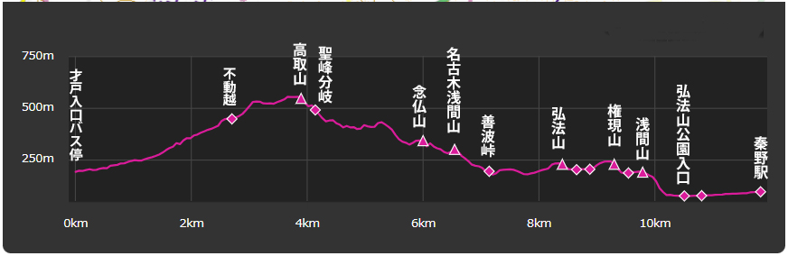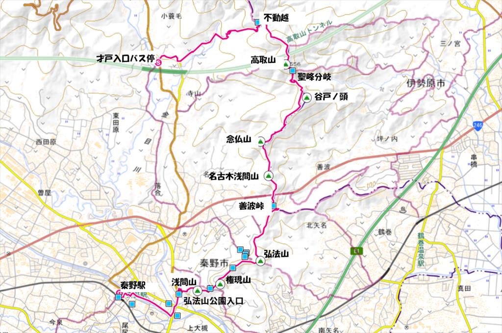 小田急線秦野駅=9:50才戸入口バス停→10:57不動越11;18→11:45高取山12:22→聖峰分岐12:30→13:25念仏山13:30→善波峠14:00→14;18弘法山14:25→14:40権現山14:47→浅間山14:55→弘法山公園入口15:17→15:40秦野駅