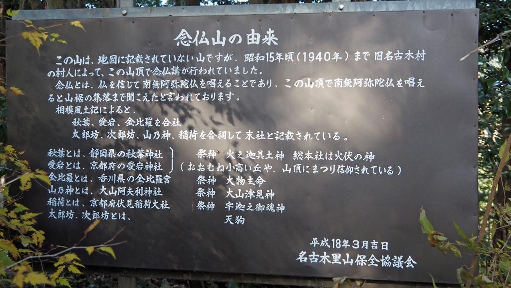 昭和の初めまで村人によって念仏講が行われており、念仏を唱える声が山の麓の集落まで聞こえてきたと言われています。今でも、山神石祠や石地蔵が残されています。