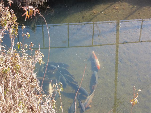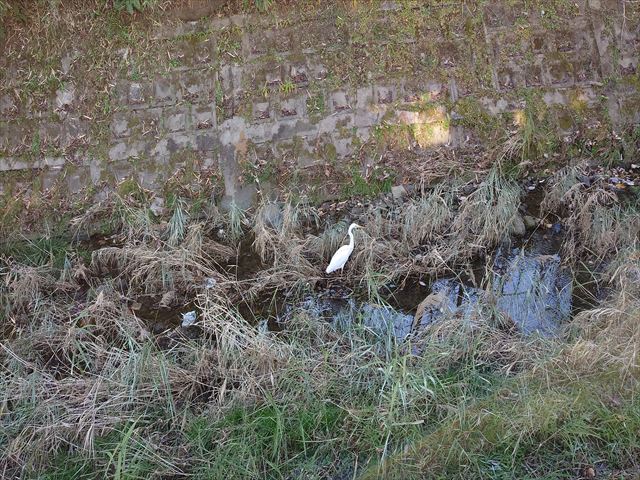 白鷺でしょうか、餌を探していました 鯉が暖かい場所を選んでジッとしていた