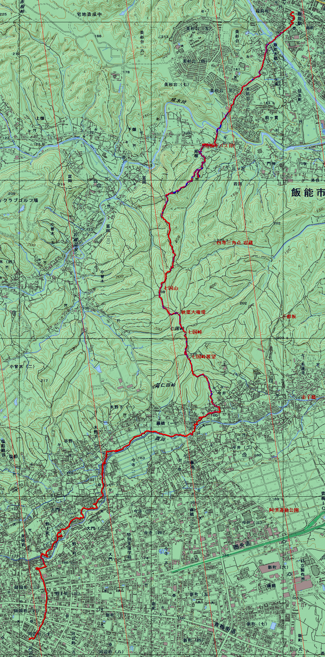 河辺駅9時20分→霞川ウォーキングコース9時35分→今寺天皇塚水田10時10分→七国広場(昼食)11時~45分→七国峠10時45分→秋葉山11時10分→秋葉神社12時30分~35分→岩渕八幡神社12時45分→尾根下バス停12時55分→飯能駅南口13時30分